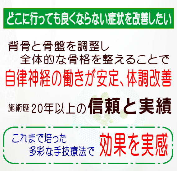 | ◆腰痛、背中痛が辛くて、長時間座っていられない ◆肩こり・首こりがひどく、頭痛がする ◆産後の骨盤調整をしたい ◆出産してから腰痛の症状が出て、痛みが取れない ◆仕事が忙しく、疲労がどうしても抜けない ◆1年中、重苦しいさや痛みがあり、症状が改善しない方 ◆山形市内の病院で色々検査したが原因がわからない ◆整体院、カイロプラクティック院、病院等色々通ったが症状の回復が見られない ◆山形市の病院で薬や注射だけで一向に症状が現状維持で改善しない方 ◆電気療法やマッサージの流れ作業的な治療方法に不満がある方 |