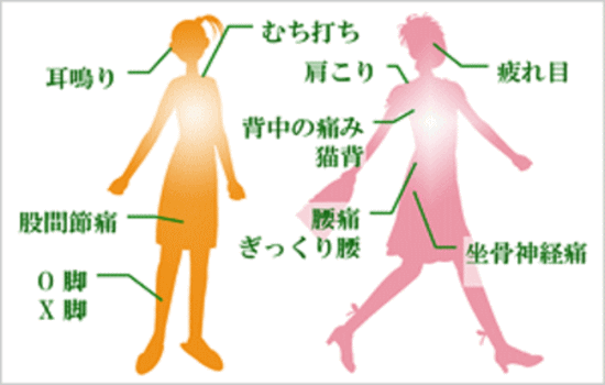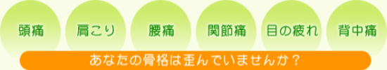| ◆当てはまる項目にチェックしてみてください。 □同じ脚を上に組んで座ることが多い □骨盤の左右の高さが違う □よくつまずいたり、転んだりする □ズボンの後ろのポケットに財布や携帯をよく入れている □肩の左右の高さが違う □頬づえをつく癖がある □同じ側の歯でかむことが多い □同じ側の肩にバッグをかけたり、同じ手で持ったりすることが多い □ヒールの靴をはくことが多い □スカートをはくとどちらかに回る □猫背である □寝るときの姿勢は、うつ伏せか横向きが多い □脚をクロスさせて立つことが多い |